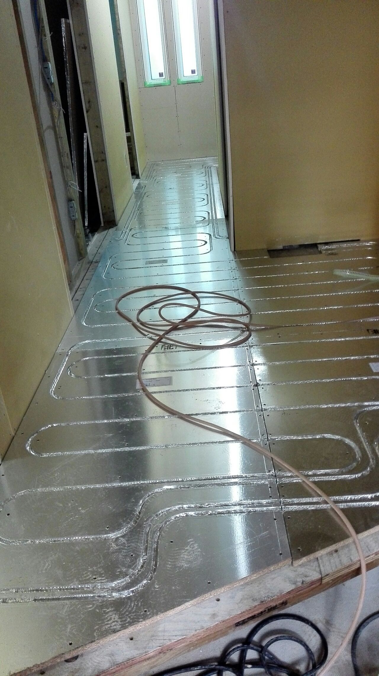 横浜住みの筋斗雲です。第31 話の銀世界に床暖房用の配管し、フローリングを施工中です。二階から始めて最後に一階を仕上げるようです。施工した後はキチンと養生してました。写真は少し白っぽくなってますが、EBコート ライトウォールナット(LWT)色です。筋斗雲邸はすべてこの色にしました。