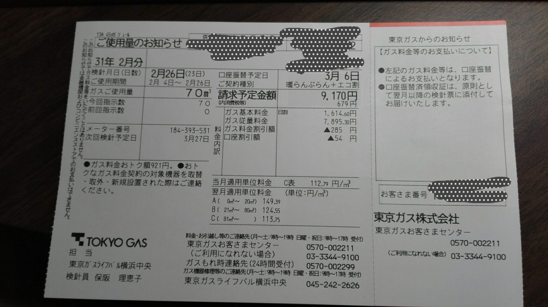 入れっぱなしの2月は26日までのガス料金23日間で70㎥、9170円でした。おそらく一ヶ月だと12500円前後ですね。
