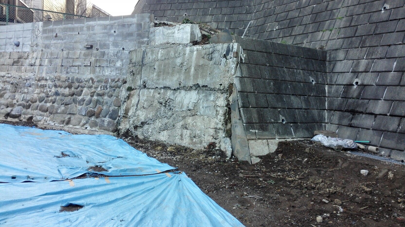敷地裏側にはマンションが建っていて5mの擁壁がある。それに接する形で昭和40年代に作られた大谷石(おおやいし)とコンクリートブロックによる二段擁壁がある。まずはこの擁壁を作り直さなくてはならない。横浜は山、坂、崖地が多く横浜市不燃化推進地域においては更に新築には注意が必要である。また、神奈川県の急傾斜崩壊危険地域に指定の地域だと横浜川崎治水事務所の許可が必要になり時間と手間がかかる。