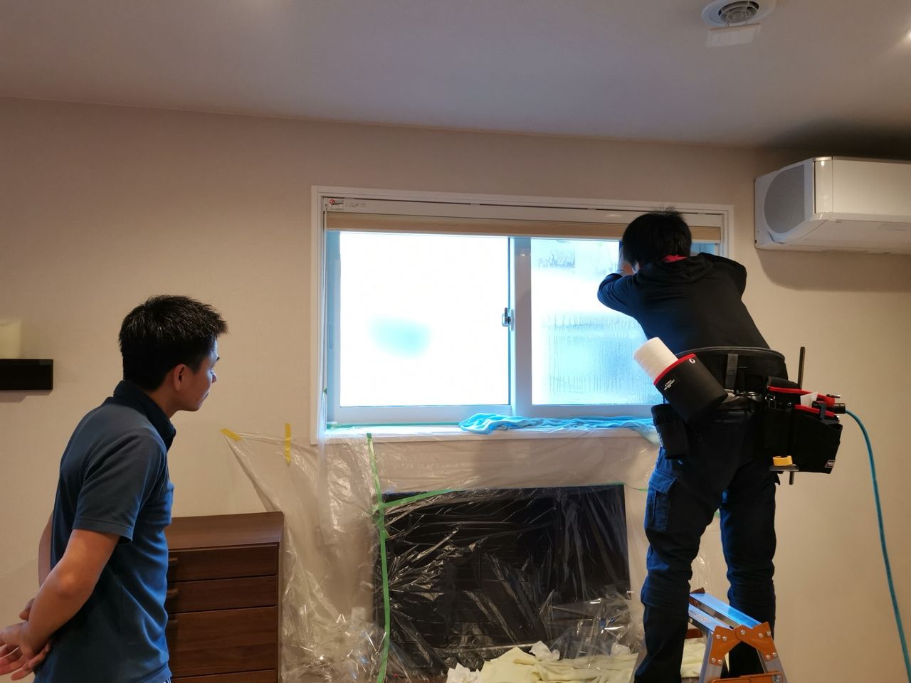 リビングの小窓、腰窓二枚で19,000円だが、20年保つというのでコストに見合うと判断し、依頼した。